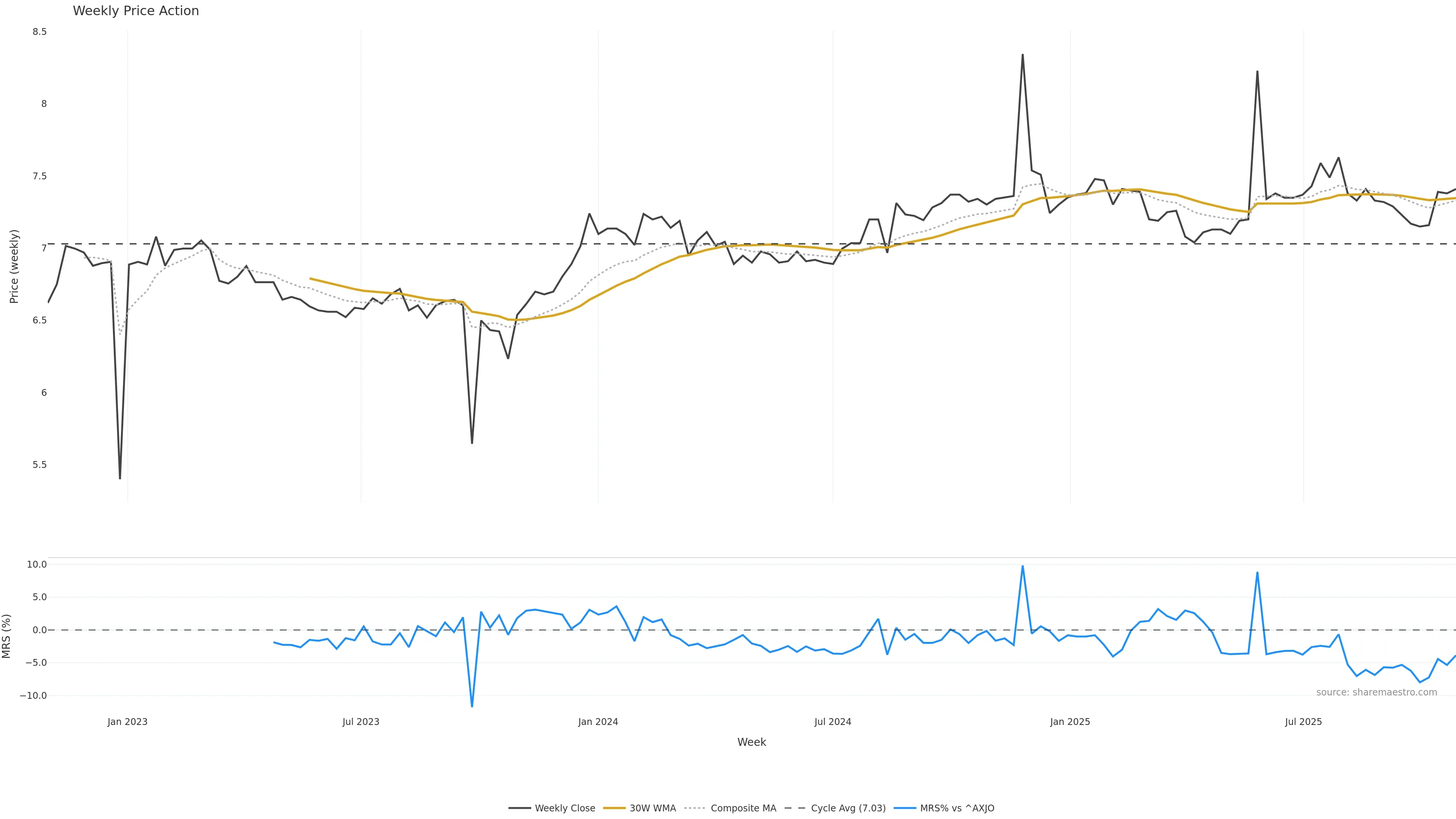 Last week closed up (0.54%), and over the last 8 weeks price is up (1.65%) with a rising slope (0.370%/w). Ranges are expanding (current 1.13× mean; 75th pct; realised vol ≈ 1.28%). Price spends time in the upper band (rising), participation is below typical with a buying-tilt bias (z -2.77), money flow is rising, and posture is above 30w & 50w (drawdown 0.00%). Balance is mixed; watch participation shifts and behaviour at the 30-week average.