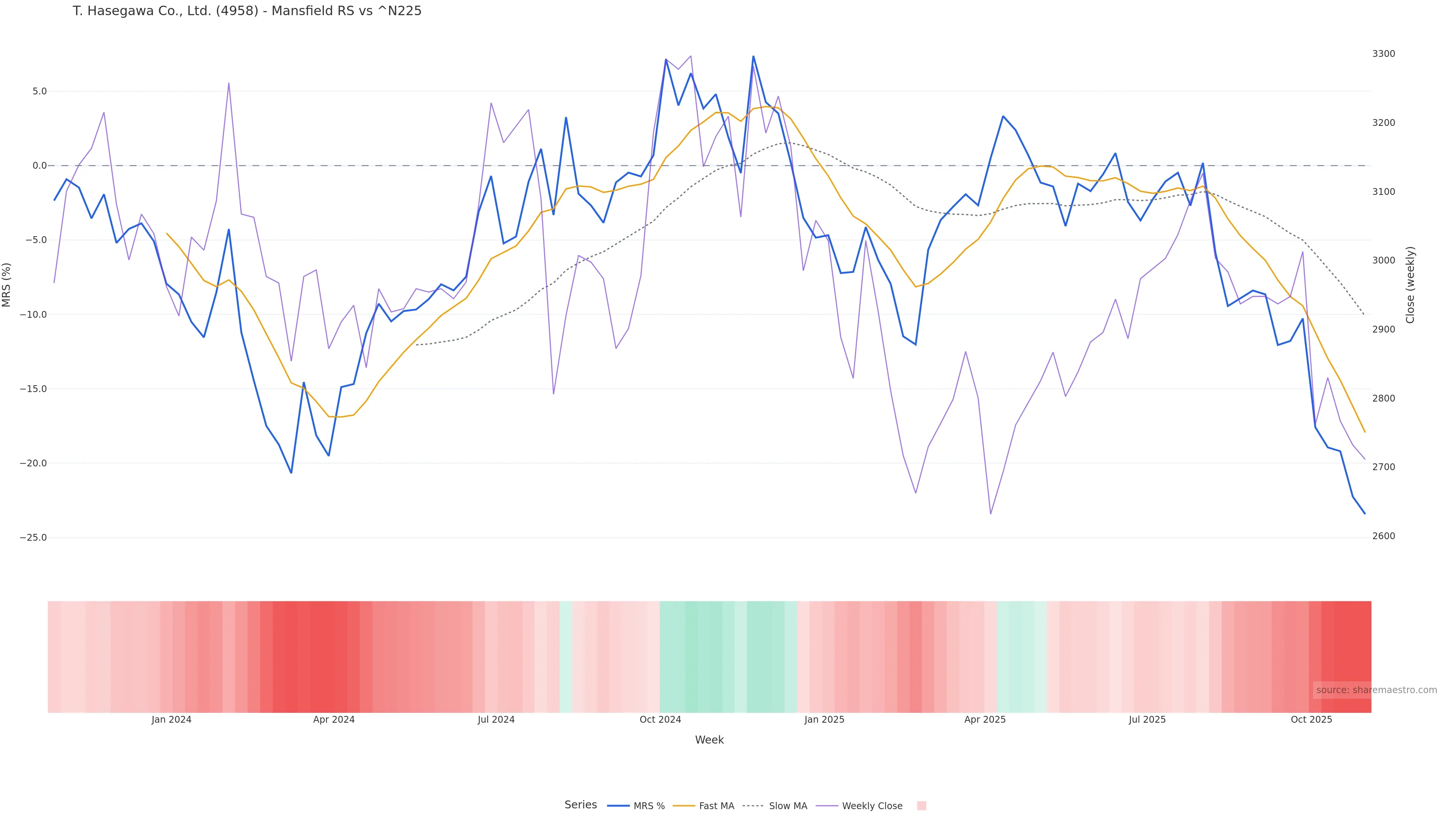 Mansfield RS vs ^N225 is negative and weakening. Avoid unless a reversal forms. In essence this reflects Mansfield relative strength trend with a bearish tilt.