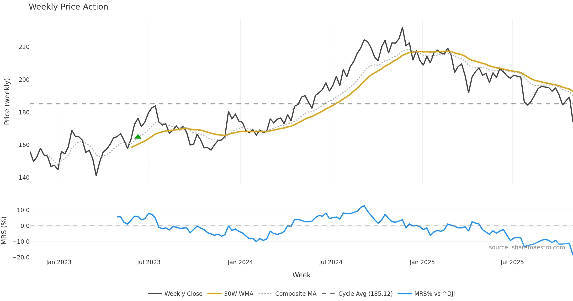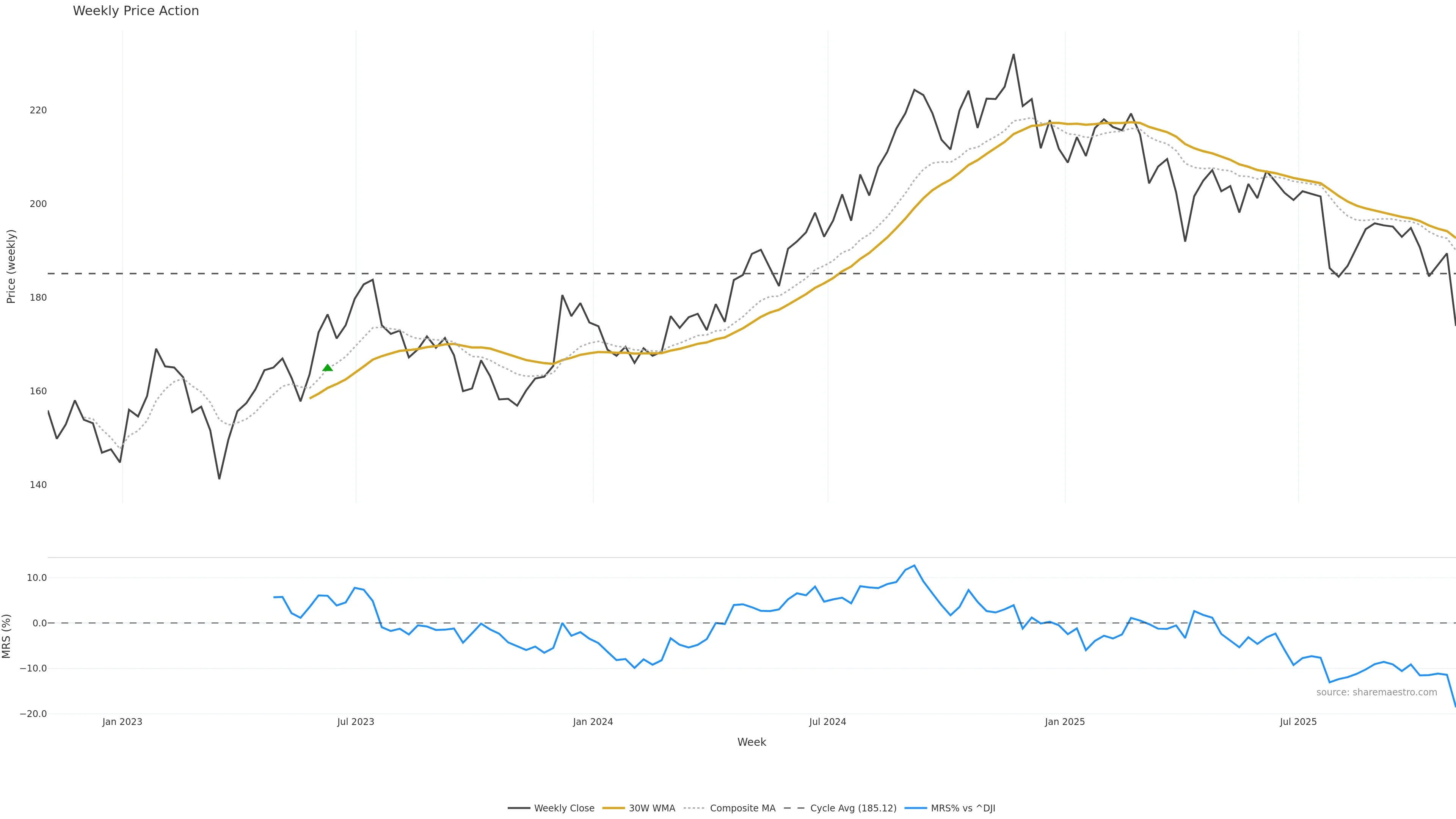 Mansfield RS vs ^DJI is negative and weakening. — Avoid unless a reversal forms.