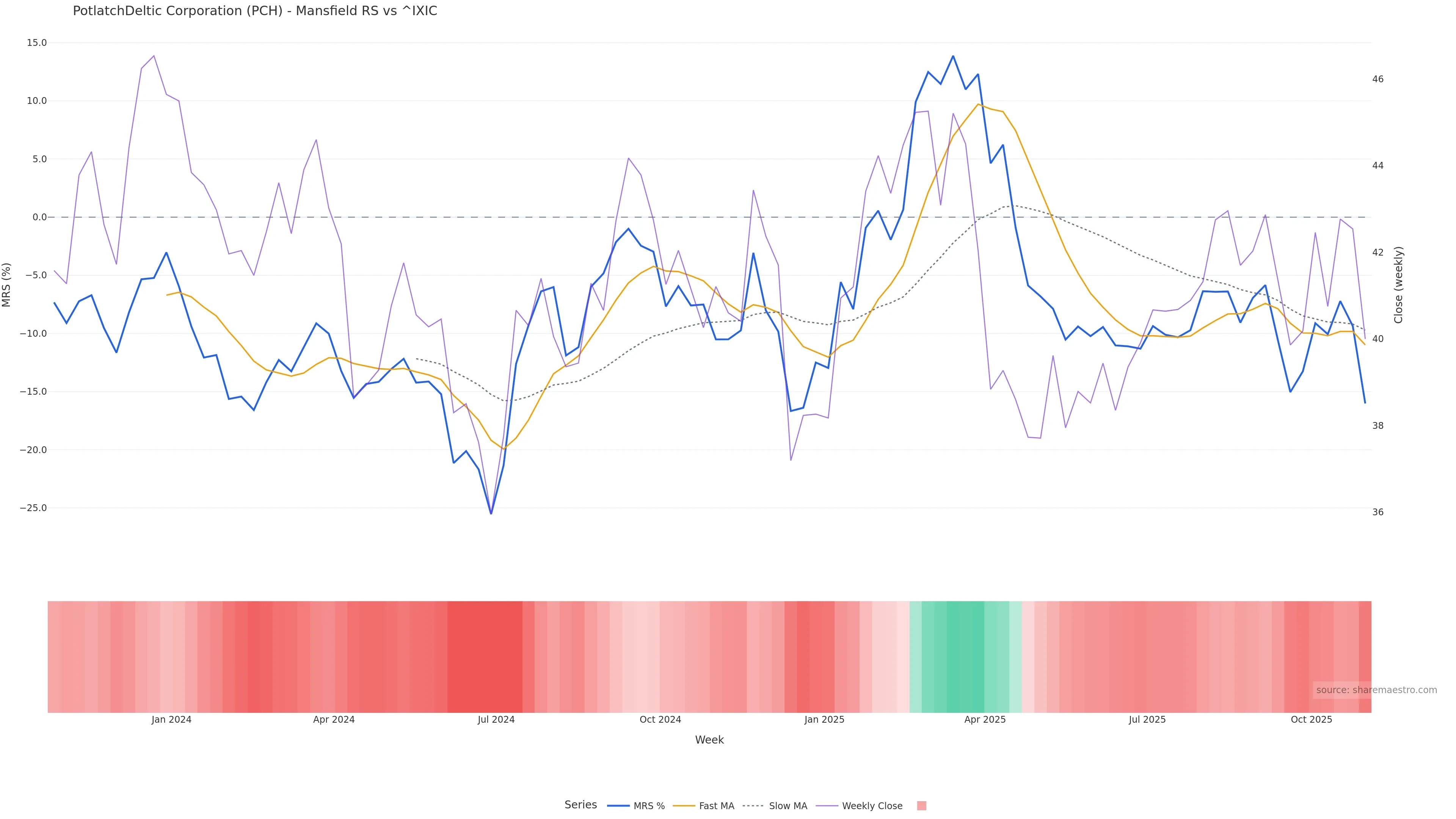 Last week closed down (-0.35%), and over the last 8 weeks price is down (-3.24%) with a rising slope (0.291%/w). Ranges are compressing (current 0.72× mean; 25th pct; realised vol ≈ 4.16%). Price spends time in the lower band (falling), participation is below typical with a selling-tilt bias (z -3.56), money flow is falling, and posture is below 30w & 50w (drawdown -6.48%). Balance is mixed; watch participation shifts and behaviour at the 30-week average.