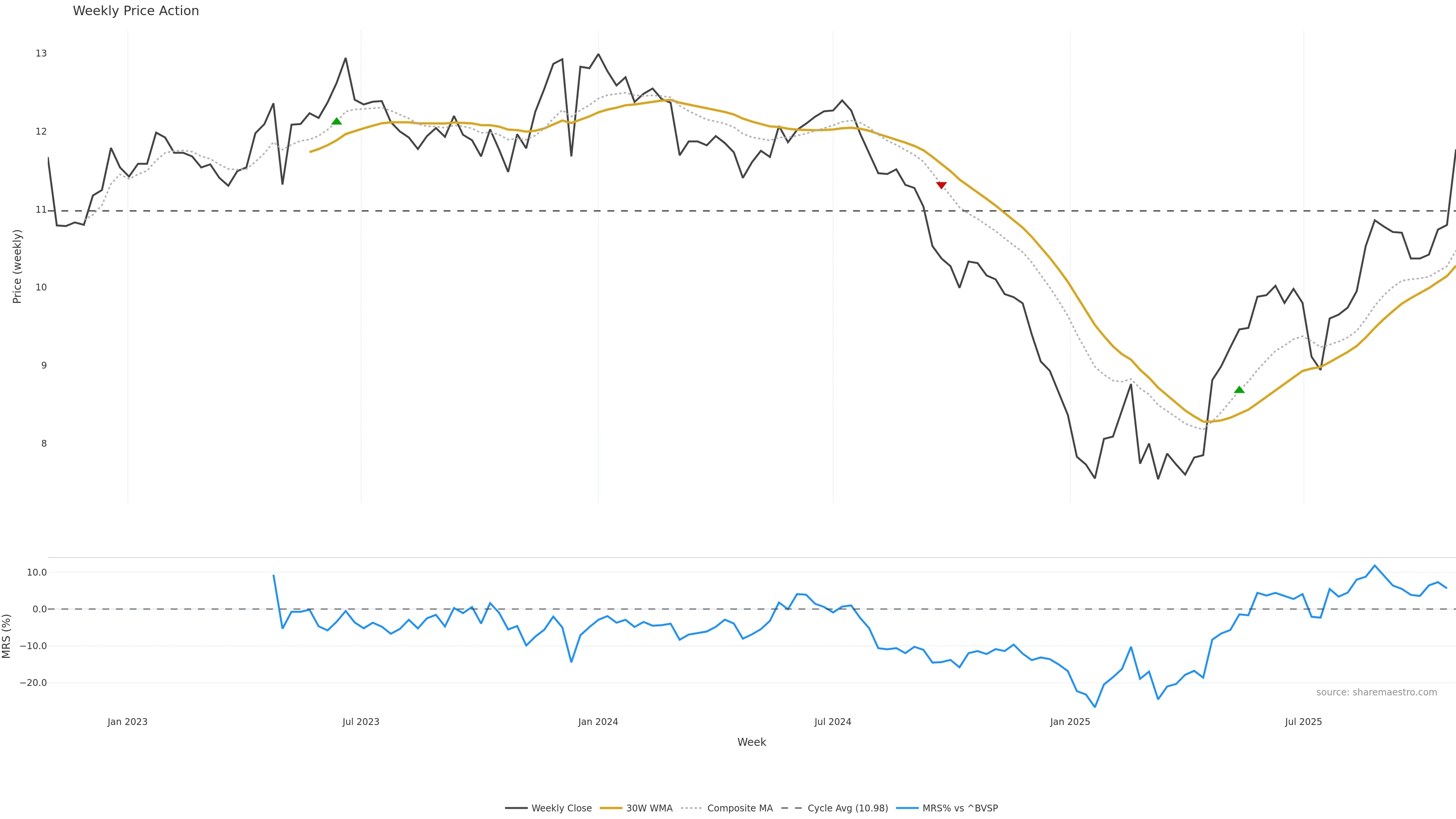 Last week closed up (2.35%), and over the last 8 weeks price is up (9.90%) with a rising slope (1.007%/w). Ranges are compressing (current 0.89× mean; 50th pct; realised vol ≈ 3.51%). Price spends time in the upper band (rising), participation is below typical with a selling-tilt bias (z -7.46), money flow is falling, and posture is above 30w & 50w (drawdown 0.00%). Balance is mixed; watch participation shifts and behaviour at the 30-week average.