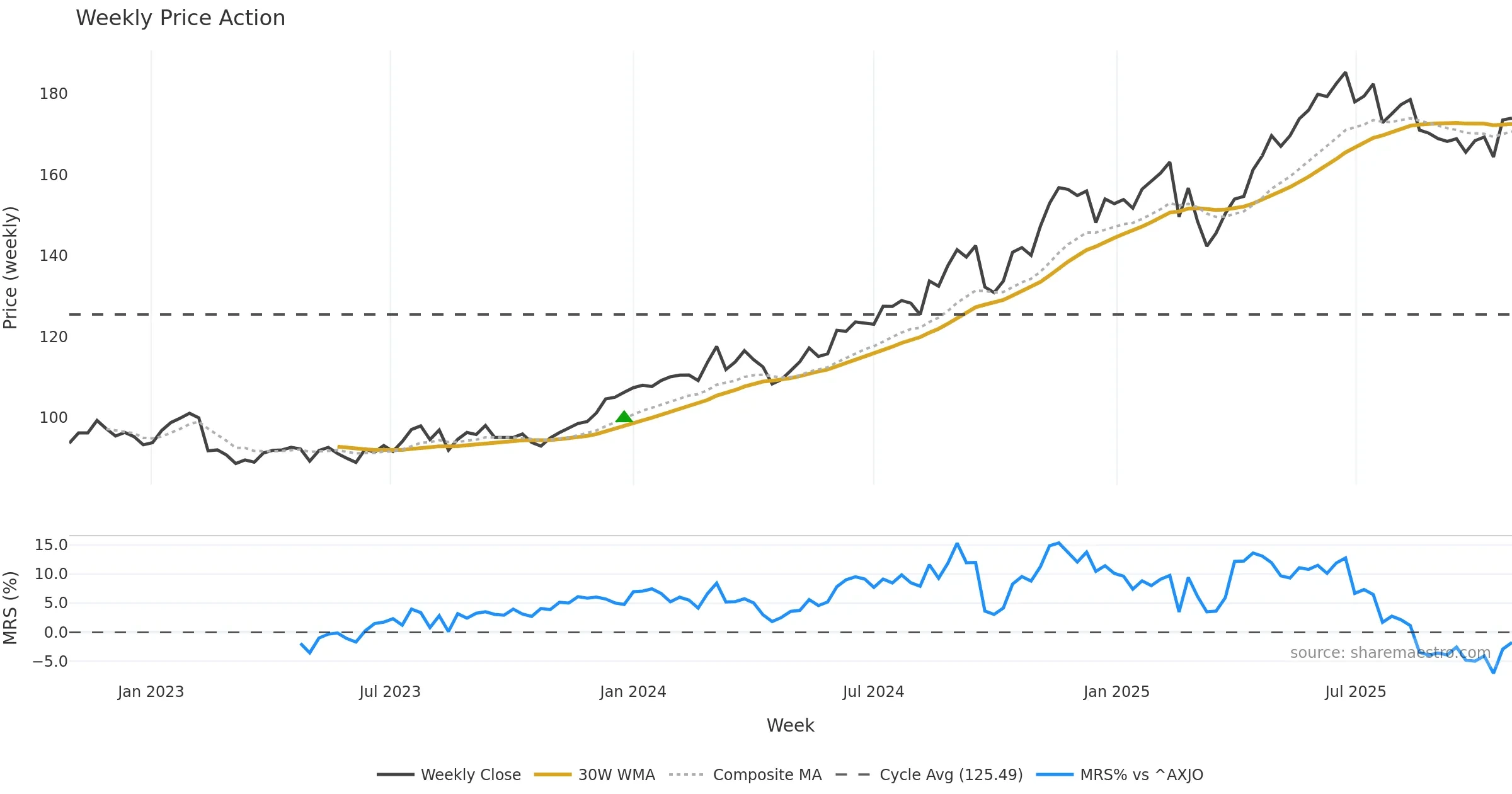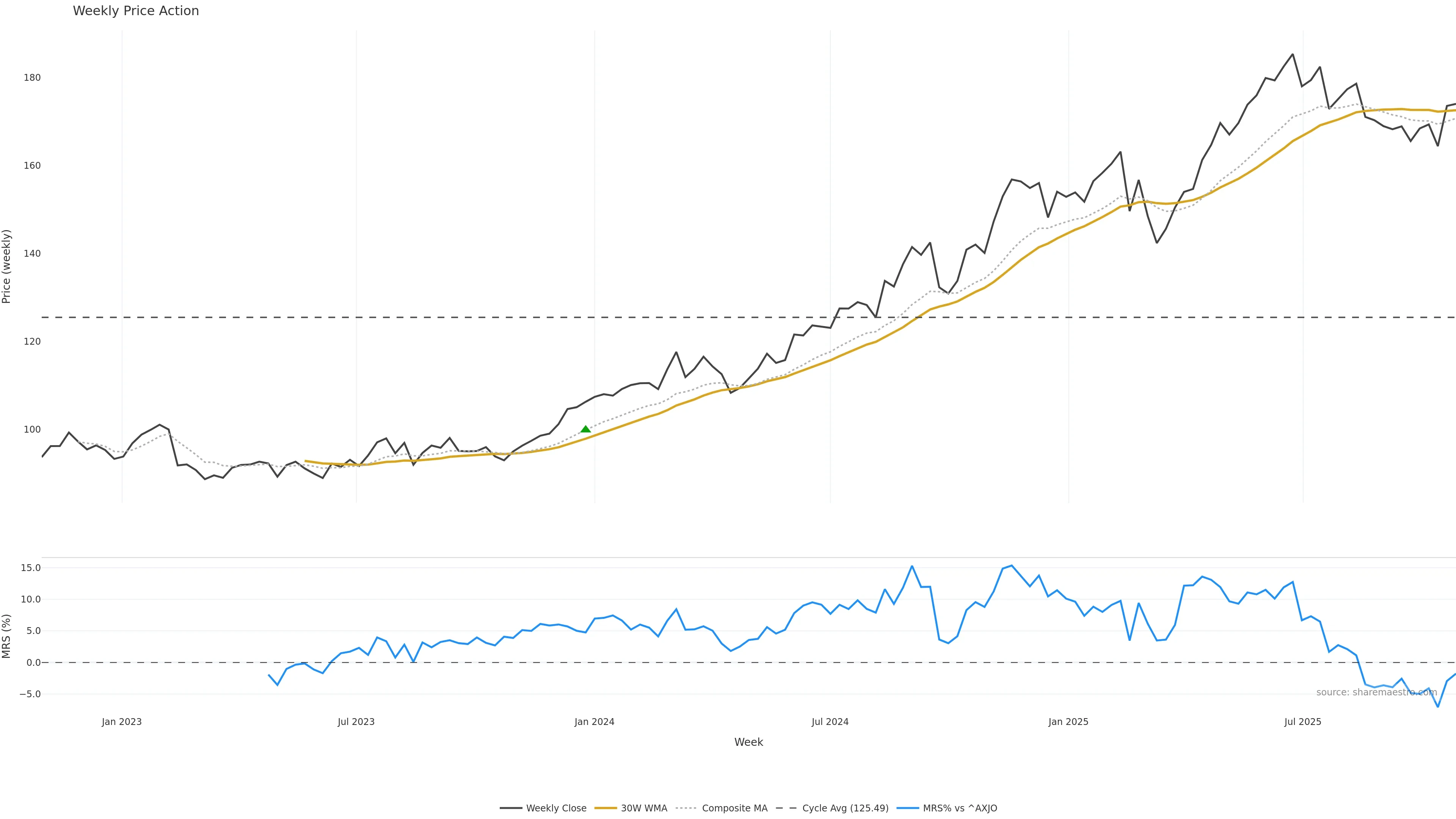 Last week closed up (1.56%), and over the last 8 weeks price is up (3.44%) with a rising slope (0.431%/w). Ranges are expanding (current 1.22× mean; 75th pct; realised vol ≈ 2.54%). Price spends time in the middle band (rising), participation is below typical with a buying-tilt bias (z -2.96), money flow is rising, and posture is above 30w & 50w (drawdown 0.00%). Balance is mixed; watch participation shifts and behaviour at the 30-week average.