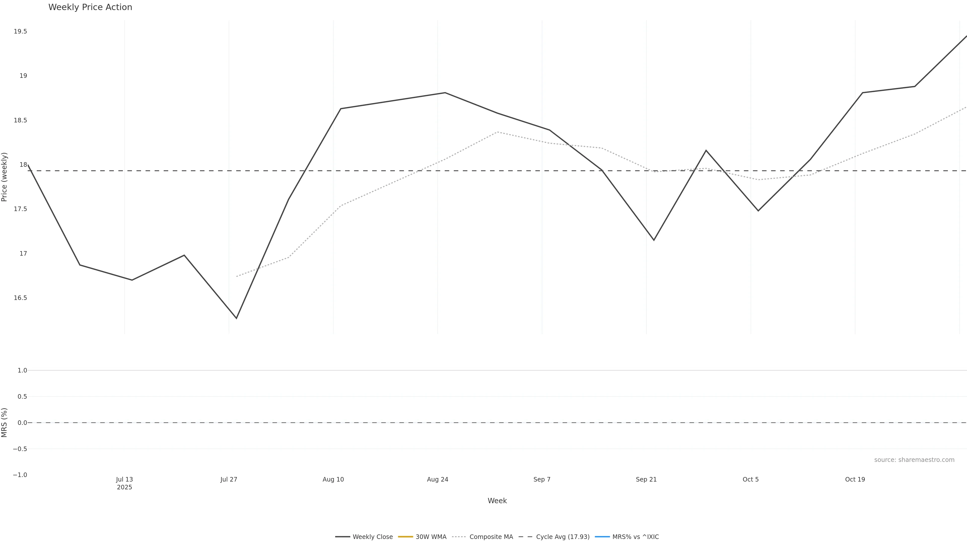 Last week closed up (2.15%), and over the last 8 weeks price is up (8.42%) with a rising slope (1.419%/w). Ranges are expanding (current 1.14× mean; 75th pct; realised vol ≈ 3.68%). Price spends time in the upper band (rising), participation is below typical with a selling-tilt bias (z -2.27), money flow is rising, and posture is above 30w & 50w (drawdown 0.00%). Balance is mixed; watch participation shifts and behaviour at the 30-week average.