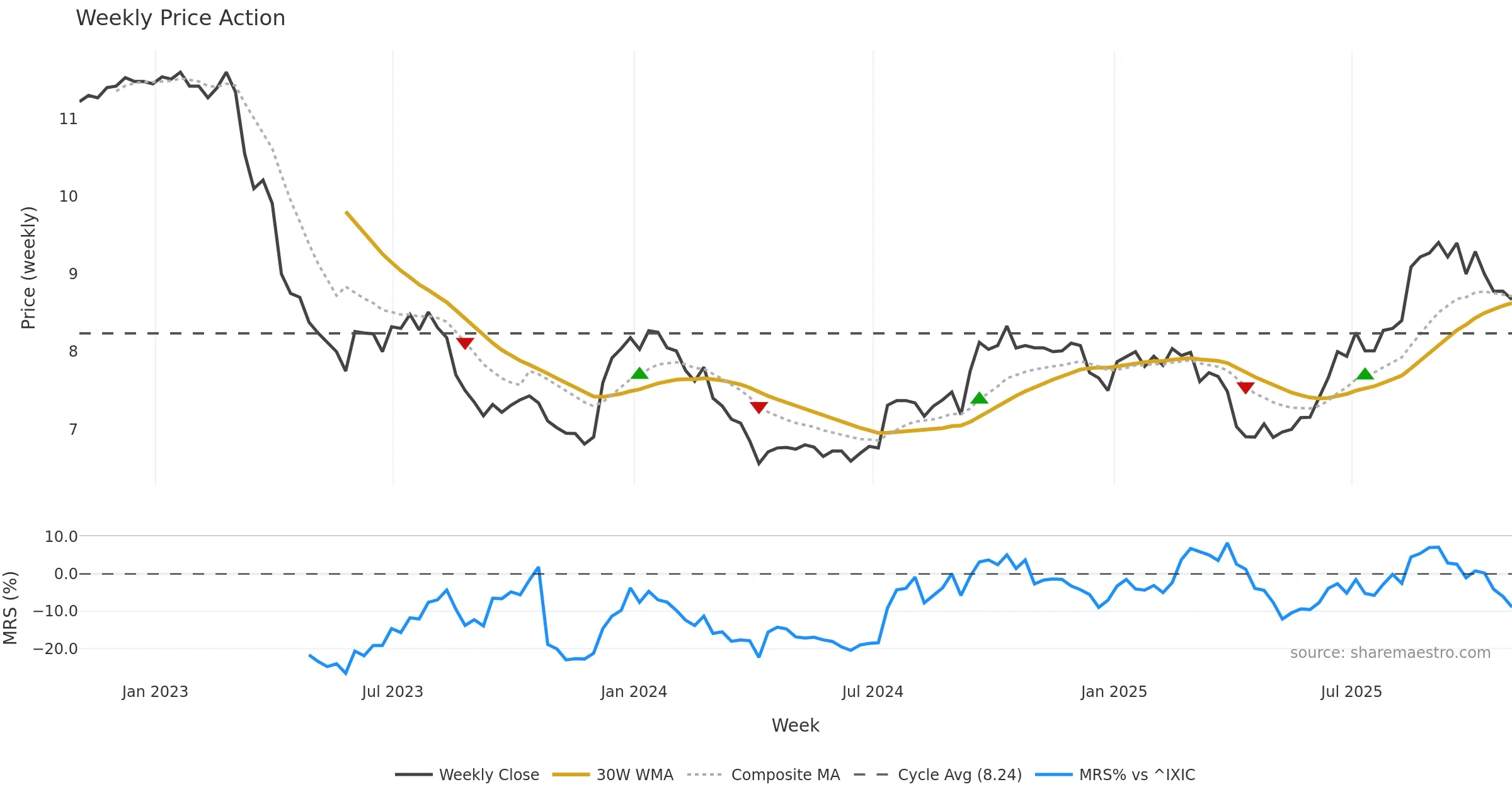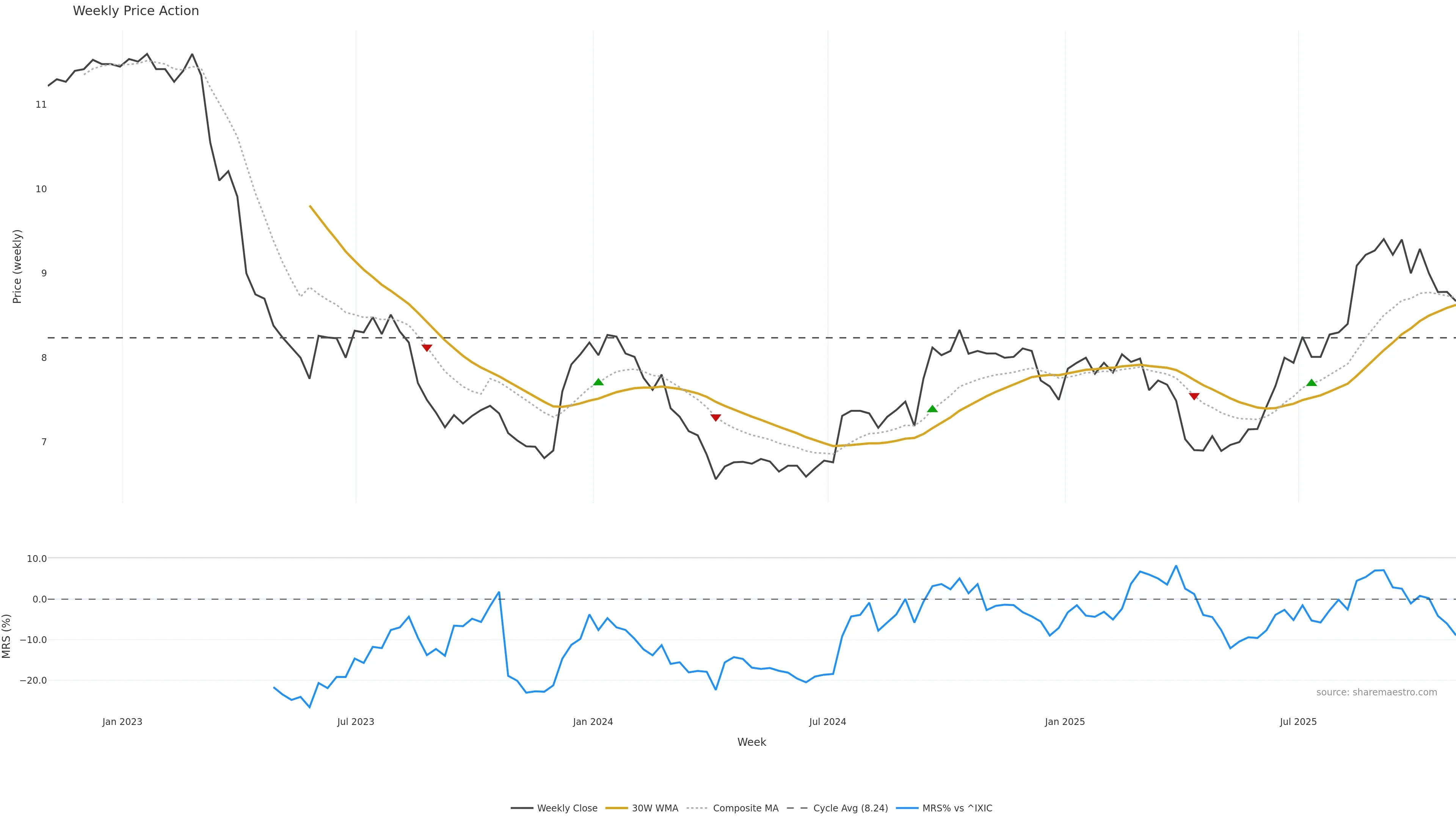 Last week closed up (0.93%), and over the last 8 weeks price is down (-5.97%) with a falling slope (-1.044%/w). Ranges are compressing (current 0.51× mean; 25th pct; realised vol ≈ 2.53%). Price spends time in the middle band (falling), participation is below typical with a buying-tilt bias (z -8.64), money flow is rising, and posture is above 30w & 50w (drawdown -7.77%). Balance is mixed; watch participation shifts and behaviour at the 30-week average.