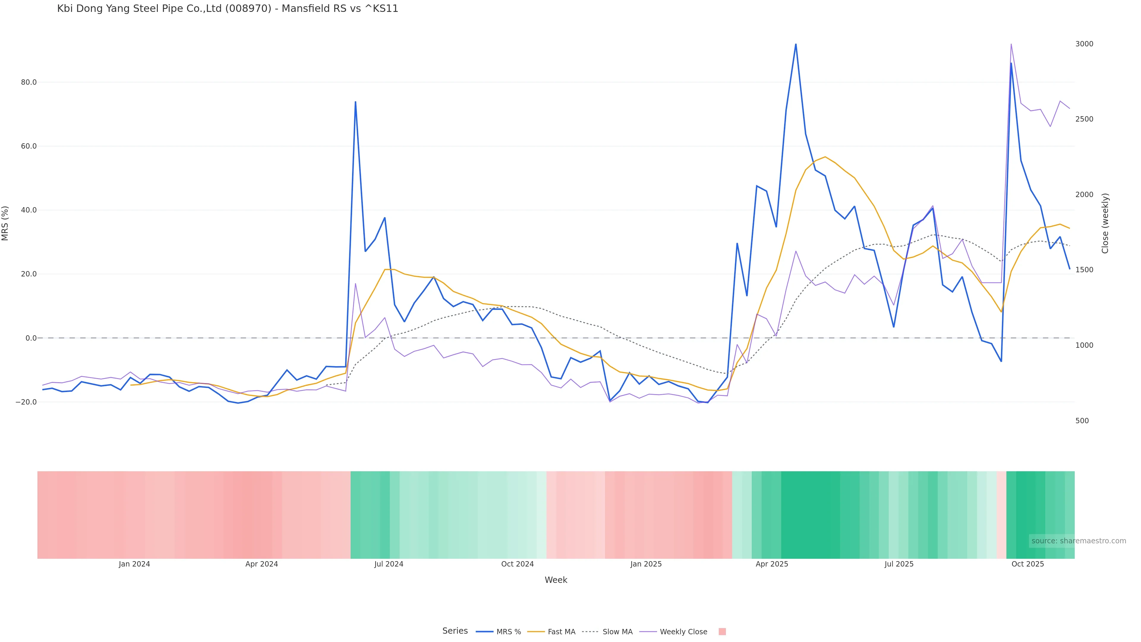 Last week closed down (-3.75%), and over the last 8 weeks price is up (81.63%) with a rising slope (2.759%/w). Ranges are expanding (current 1.24× mean; 62th pct; realised vol ≈ 40.41%). Price spends time in the lower band (falling), participation is below typical with a balanced bias (z -3.67), money flow is rising, and posture is below 30w, above 50w (drawdown -14.33%). Balance is mixed; watch participation shifts and behaviour at the 30-week average.