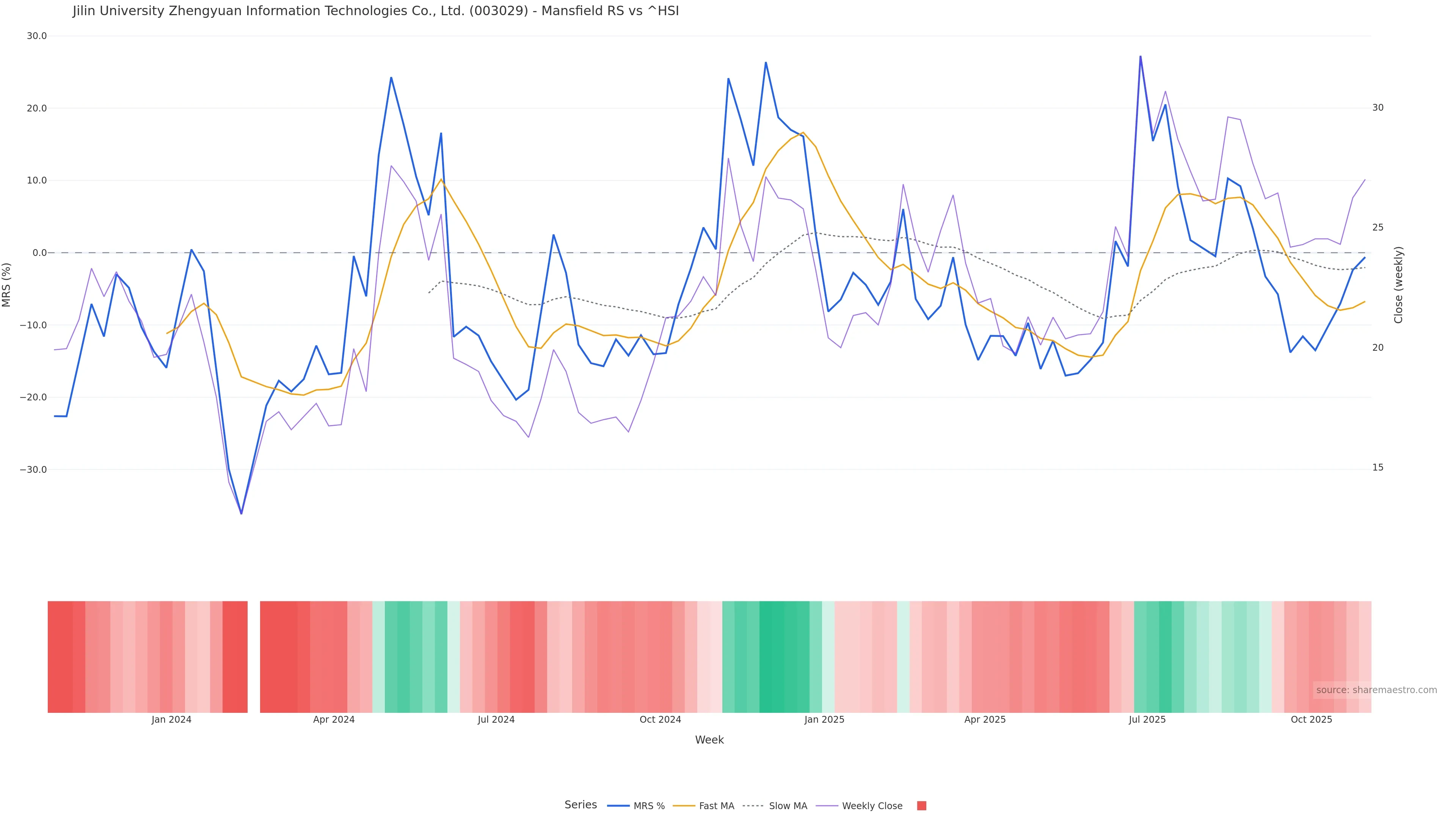 Last week closed up (2.86%), and over the last 8 weeks price is up (2.16%) with a rising slope (0.677%/w). Ranges are expanding (current 1.36× mean; 88th pct; realised vol ≈ 4.57%). Price spends time in the middle band (falling), participation is below typical with a buying-tilt bias (z -3.45), money flow is rising, and posture is above 30w & 50w (drawdown 0.00%). Balance is mixed; watch participation shifts and behaviour at the 30-week average.