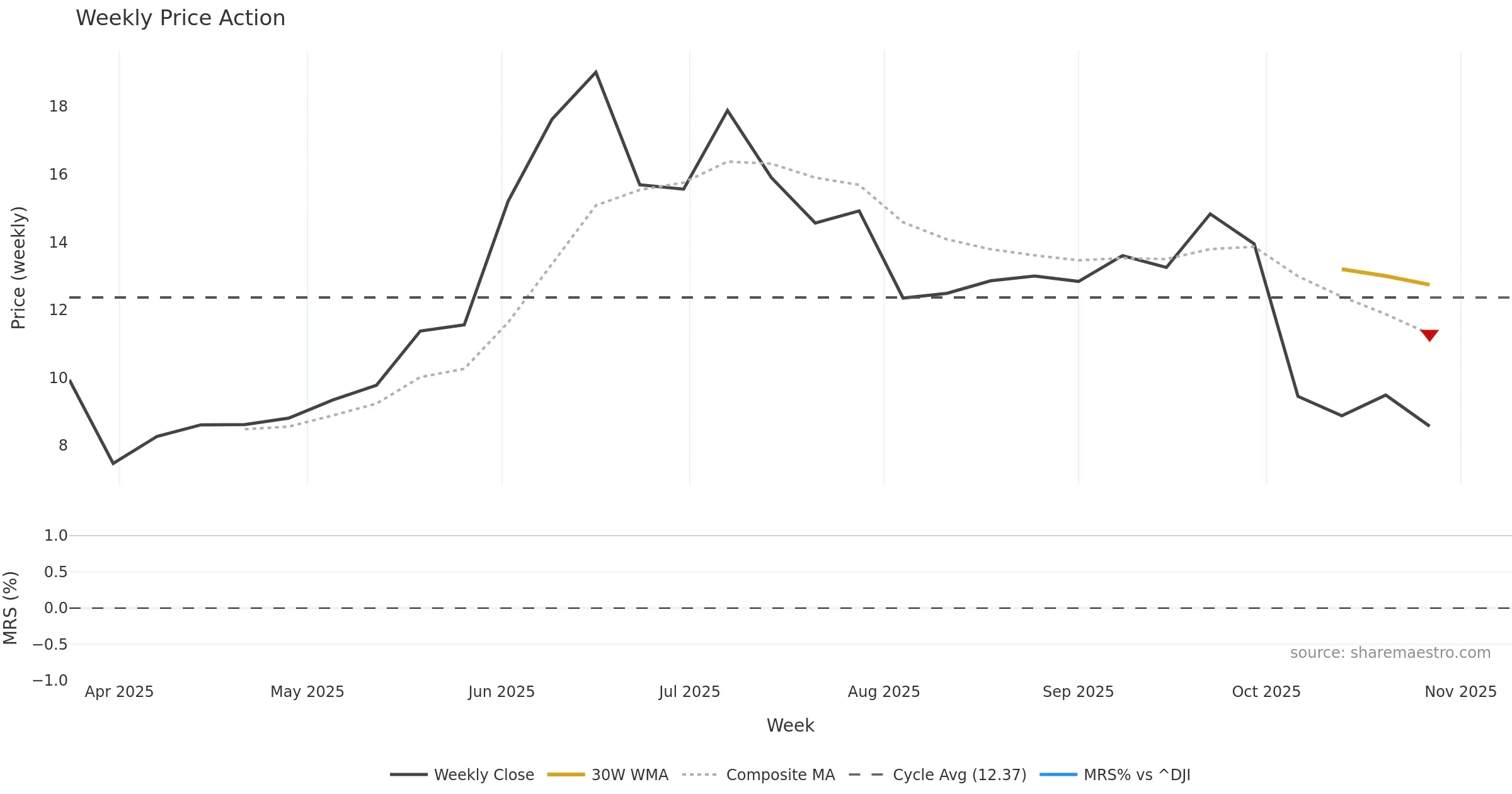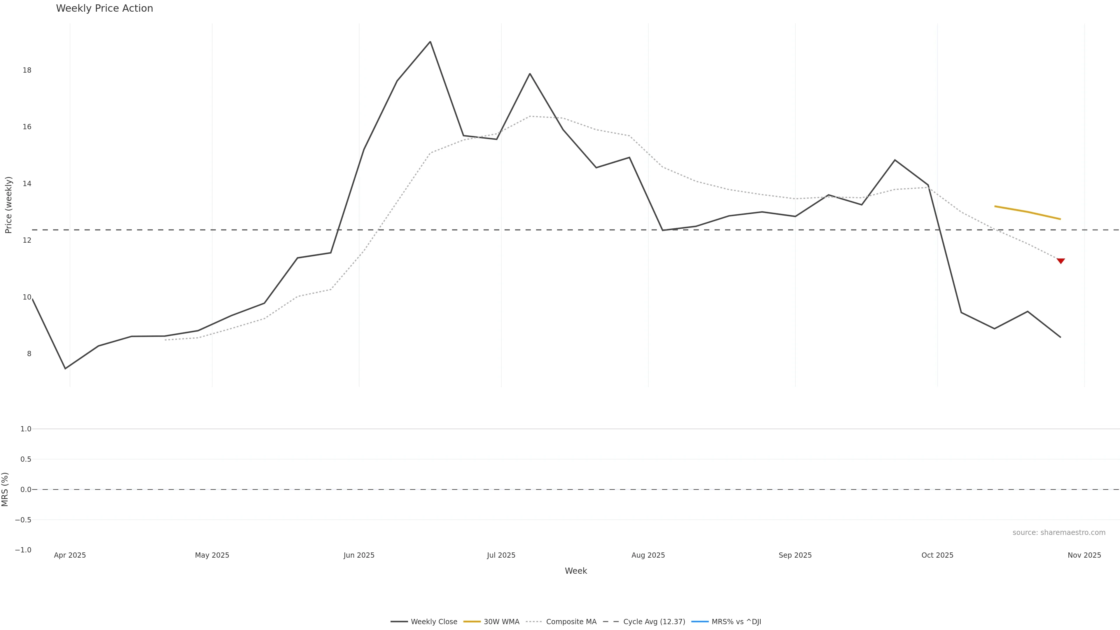 Last week closed down (-10.26%), and over the last 8 weeks price is down (-36.99%) with a falling slope (-7.903%/w). Ranges are expanding (current 0.65× mean; 50th pct; realised vol ≈ 13.09%). Price spends time in the lower band (falling), participation is above typical with a selling-tilt bias (z +1.34), money flow is falling, and posture is below 30w & 50w (drawdown -42.21%). Pressure favours further decline unless momentum repairs.