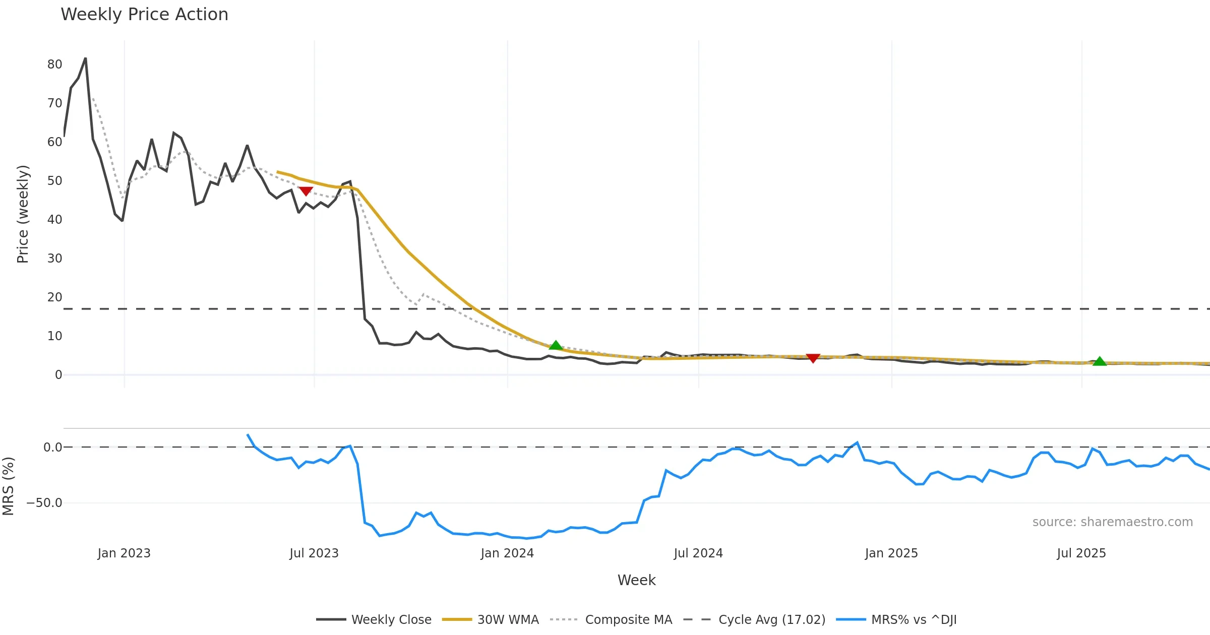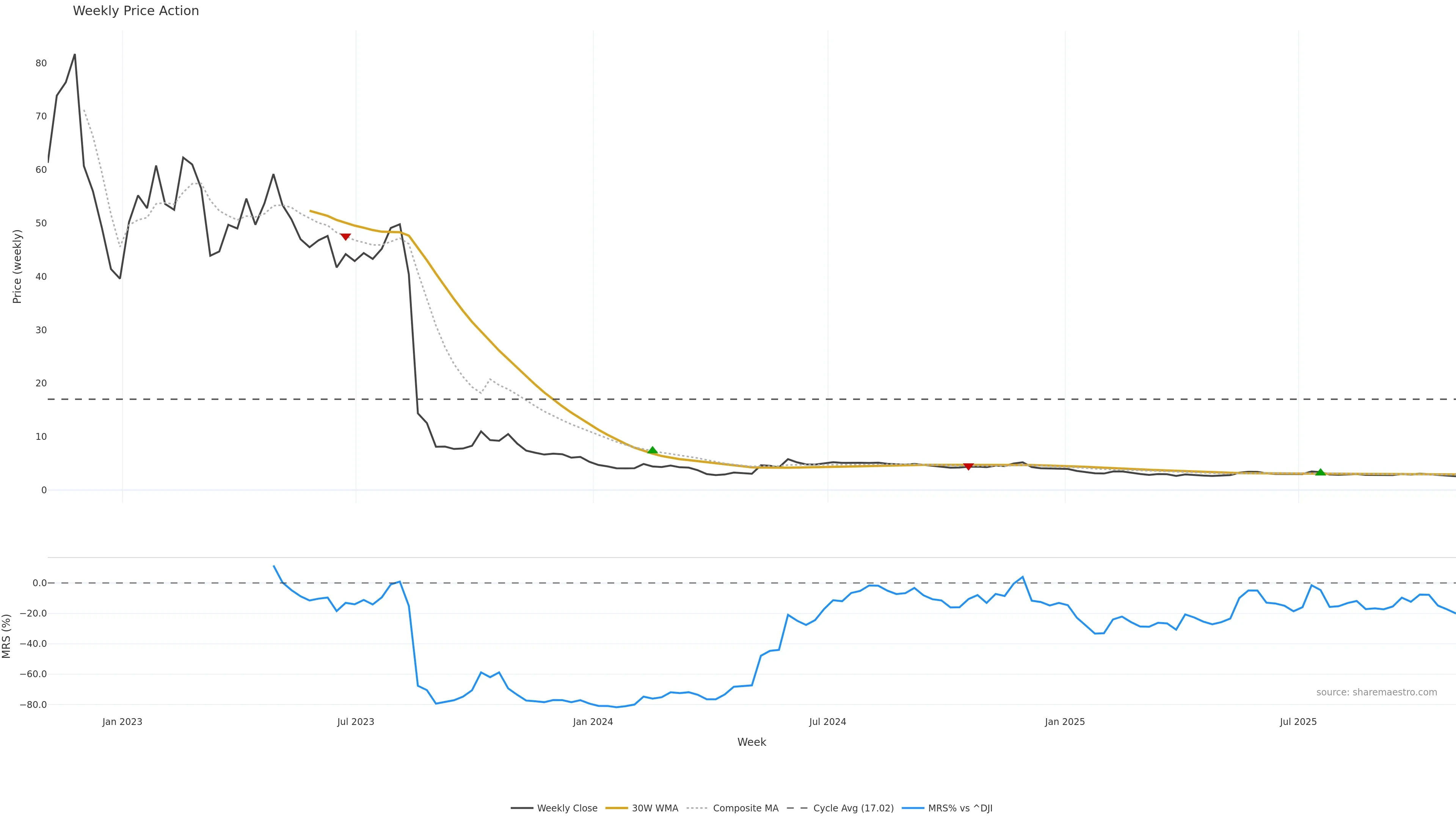 Mansfield RS vs ^DJI is negative and weakening. — Avoid unless a reversal forms.