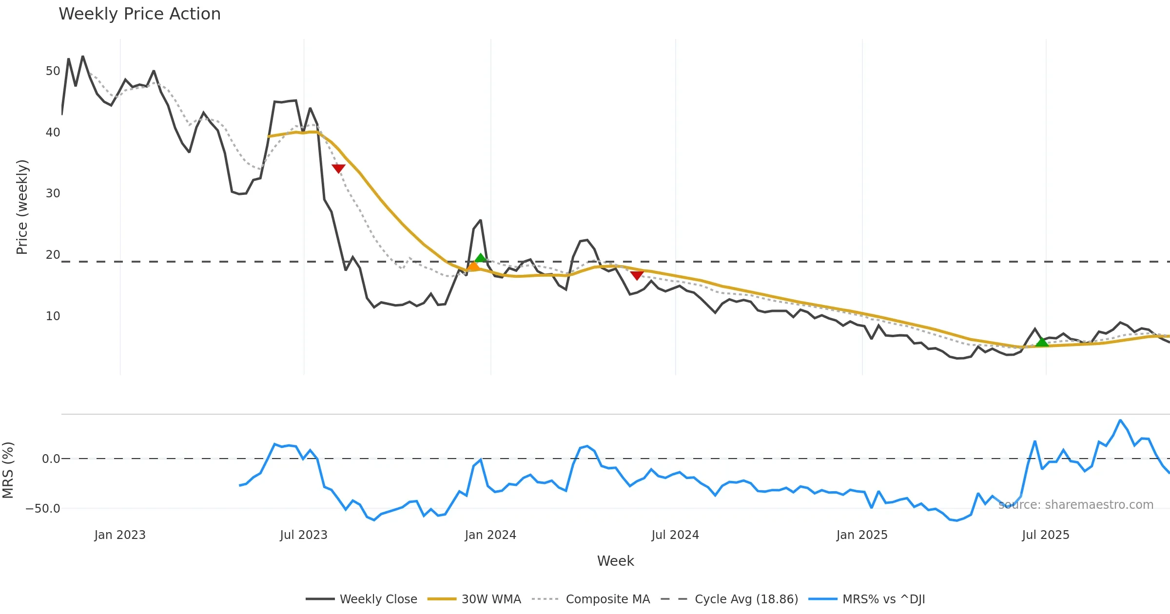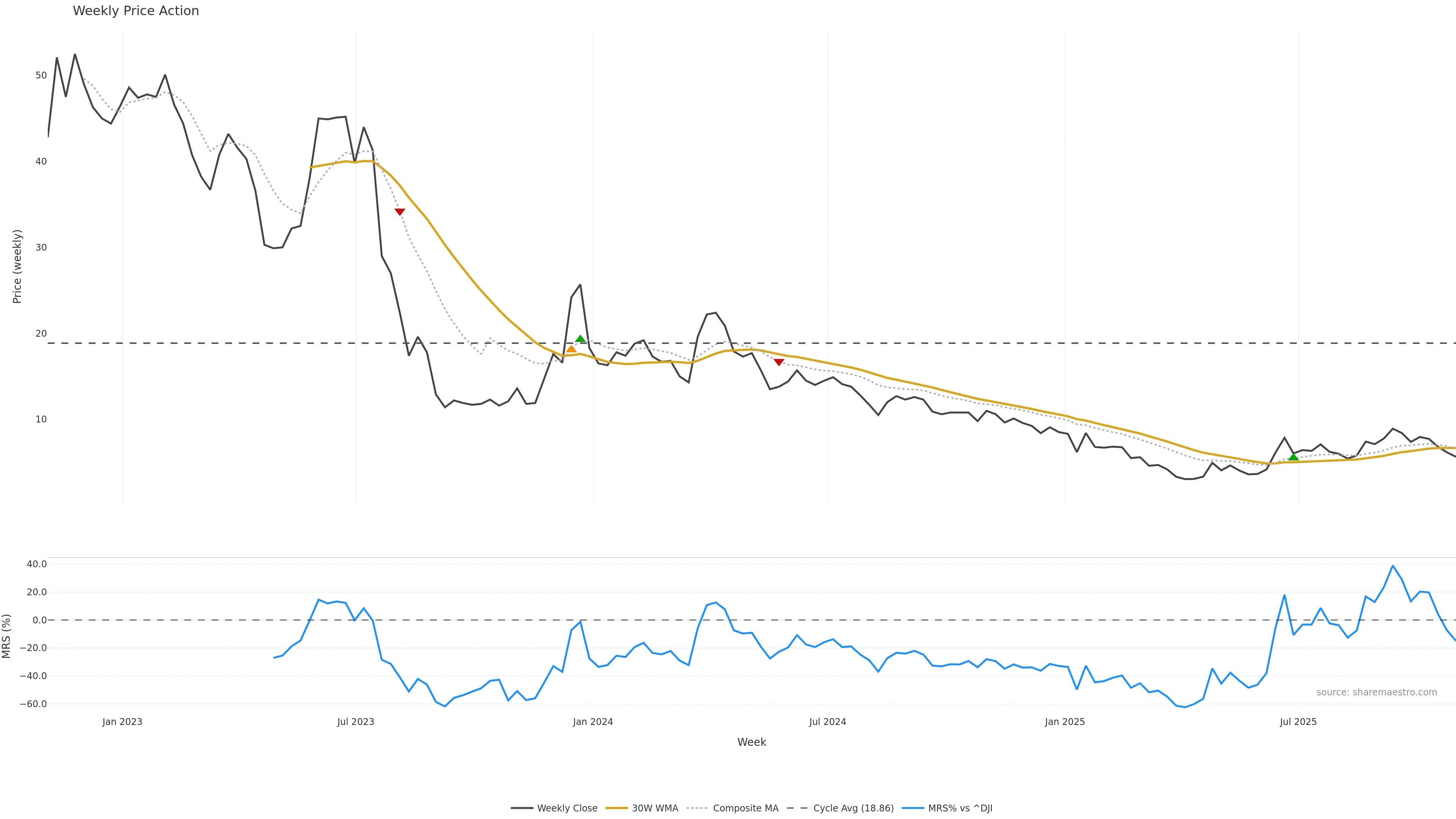 Last week closed up (5.02%), and over the last 8 weeks price is down (-36.66%) with a falling slope (-5.810%/w). Ranges are compressing (current 0.76× mean; 62th pct; realised vol ≈ 6.43%). Price spends time in the lower band (falling), participation is below typical with a buying-tilt bias (z -12.30), money flow is rising, and posture is below 30w & 50w (drawdown -36.66%). Balance is mixed; watch participation shifts and behaviour at the 30-week average.