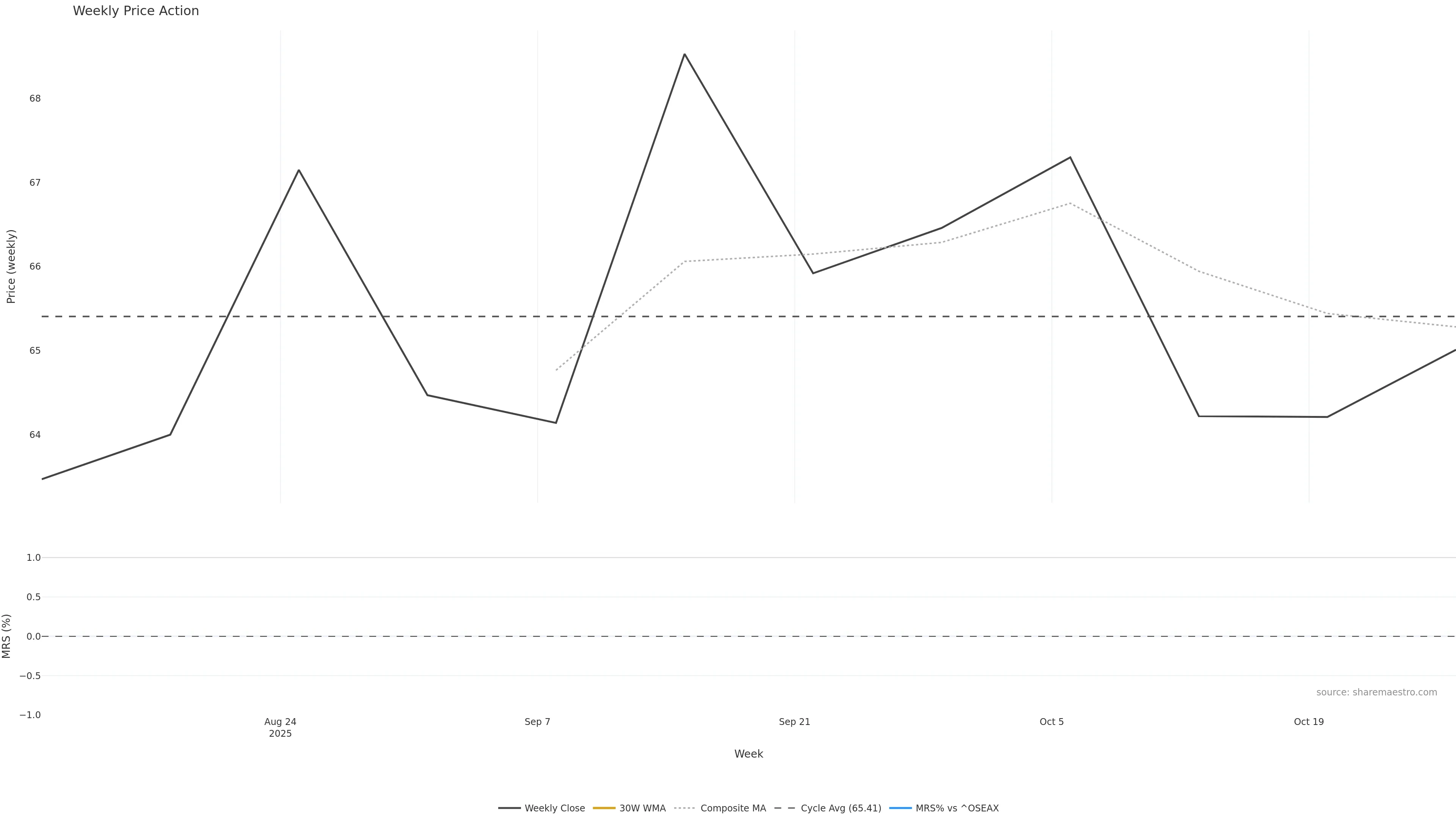 Last week closed up (1.03%), and over the last 8 weeks price is up (1.36%) with a falling slope (-0.358%/w). Ranges are compressing (current 0.60× mean; 38th pct; realised vol ≈ 3.50%). Price spends time in the middle band (falling), participation is below typical with a buying-tilt bias (z -4.04), money flow is rising, and posture is above 30w & 50w (drawdown -5.14%). Balance is mixed; watch participation shifts and behaviour at the 30-week average.